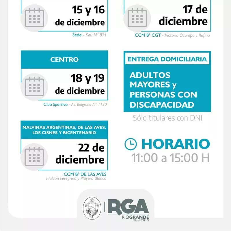 Las entregas de los módulos alimentarios se realizarán en diferentes puntos estratégicos de Río Grande, siguiendo un cronograma establecido para facilitar el acceso a todos los beneficiarios. La primera jornada será el lunes 15 y martes 16 de diciembre en Kau 871, destinado a las familias de la zona sur de la ciudad. Para estas jornadas, los titulares deben presentarse con su DNI en el horario de 11 a 15 horas. Es importante aclarar que la entrega es únicamente para las personas empadronadas, y los beneficiarios deben acudir personalmente.