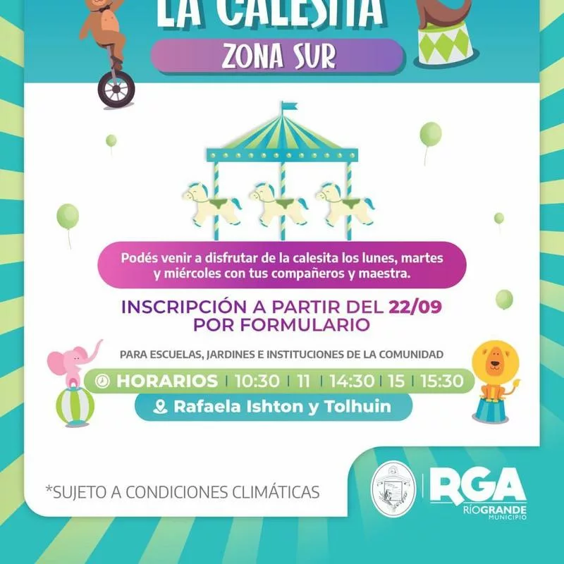 Ubicada en Rafaela Ishton y Tolhuin, la Calesita de Zona Sur se convierte en un punto de encuentro para las infancias riograndenses. La actividad se realiza los lunes, martes y miércoles en horarios distribuidos a lo largo del día: 10.30, 11, 14.30, 15 y 15.30 horas. Estos momentos están pensados para facilitar la participación de los niños y niñas, permitiendo que disfruten de juegos y actividades en un espacio abierto, seguro y diseñado especialmente para ellos.